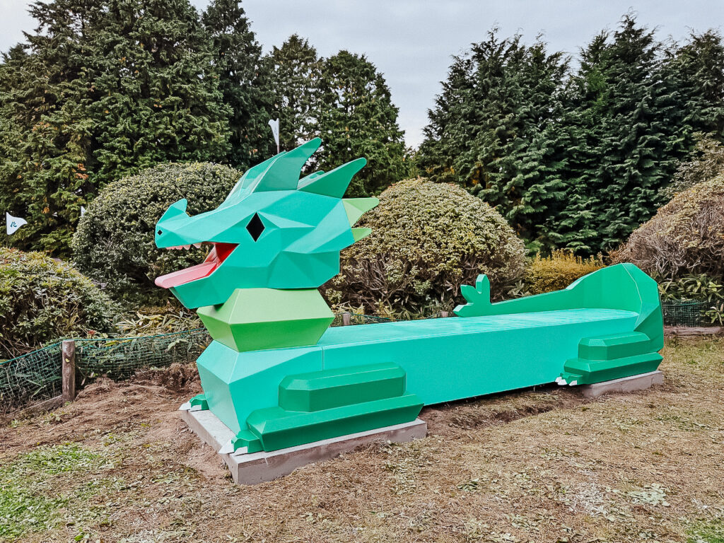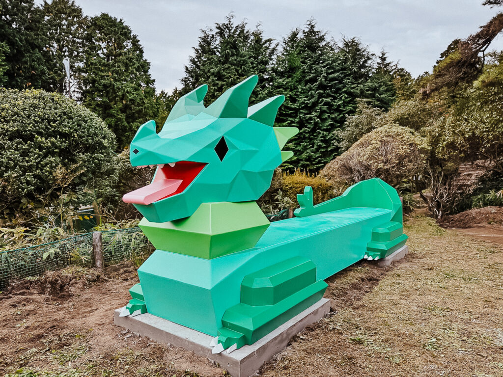 当社では、FRP造形による巨大なドラゴンネットや、モルタル造形で仕上げた石碑オブジェなど、施設全体の世界観を体現する立体物を制作しました。